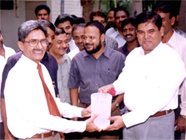 Mysore. 16th June, 2002. A symbolic gesture of dedicating the Roof Rainwater Harvesting System the Deputy Commissioner Mr. B. Basavaraju I.A.S., seen handing over the first water collected through the system at the Youth Hostel to the Warden, Commander N S Sirohi (Retd). |